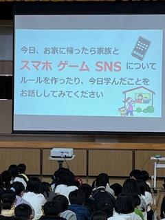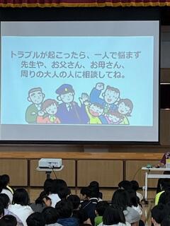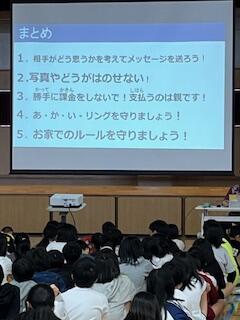 今日は、豊見城警察署生活安全課少年係の黒澤さんと金城さんを講師としてお招きして、『SNSトラブル防止教室』を開きました。SNS上に載っている情報を信じ込まない、大切な情報をアップしない、マナーを守って使う、課金をしない、有害情報をシャットアウトするなどについて学習しました。今日学習したことについて、各家庭でもスマホやゲームについて、お子さんと話し合われてください。