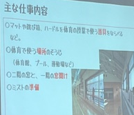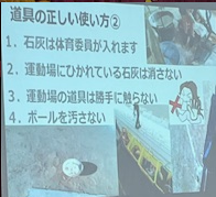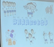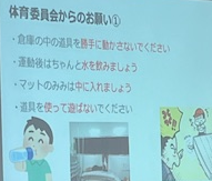 もうすぐ、高良小の運動会がやってきます。そこで今回の児童朝会では、体育委員会が発表しました。はじめに、委員会の仕事内容の説明をしました。次に守ってほしい道具の使い方について、最後に体育委員会からのお願いがありました。わたしたちが、体育館や運動場で運動ができるのは、体育委員会のみなさんのおかげだということが、よく分かりました。体育委員のみなさん、これからもよろしくお願いします。