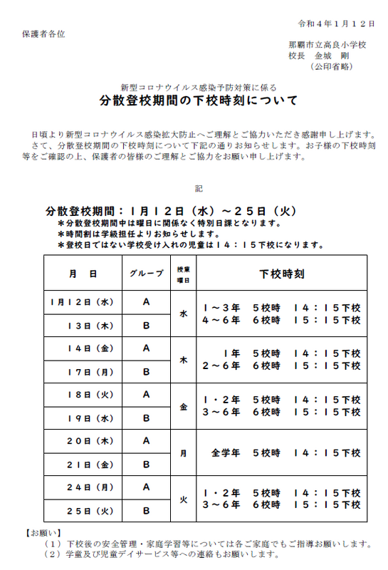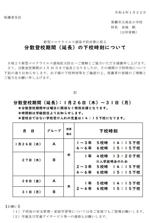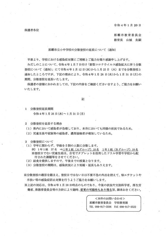 那覇市教育委員会より「那覇市立小中学校の分散登校の延長について」の通知が届いております。ご確認下さい。