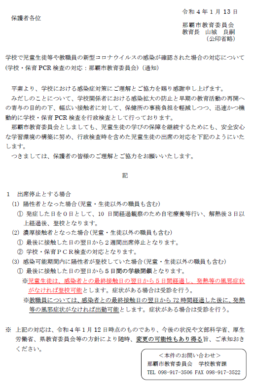 【保護者用】R40113 学校で児童生徒等や教職員の新型コロナウイルスの感染が確認された場合の対応について(那覇市教育委員会)(通知).pdf