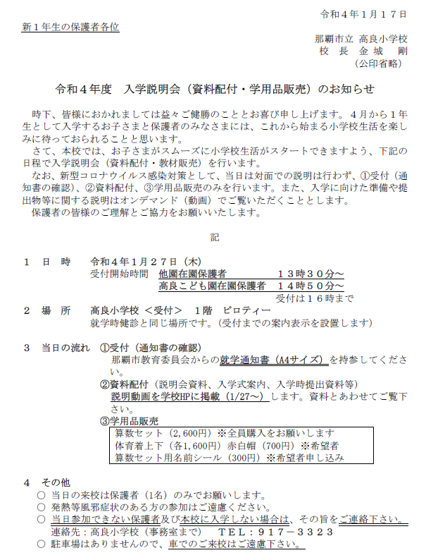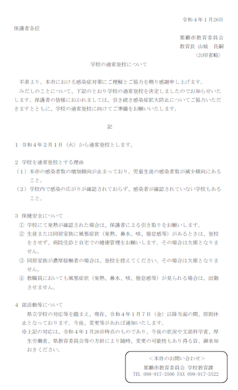 那覇市教育委員会より「学校で児童生徒等や教職員の新型コロナウイルスの感染が確認された場合の対応について」通知が届いています。ご確認ください。