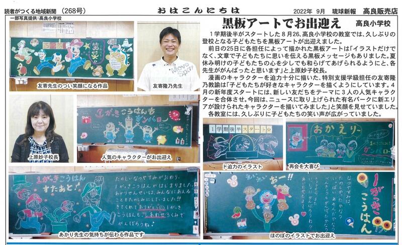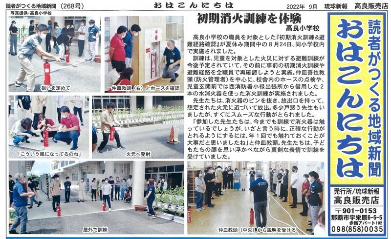 先日、琉球新報「読書がつくる地域新聞 おはこんにちは」に高良小が紹介されていました。内容は「初期消火訓練の様子」「黒板アートでお出迎え」についてでした。