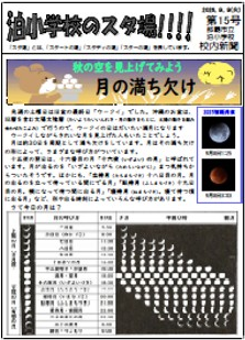 本日は、第24・25号を発行しました。 24号は「泊っ子まつりポスター表彰」について、25号は「月の満ち欠け・皆既月食」についてです。 月の満ち欠けは、4年生と6年生の理科で学習します。日々変わる月の形や見える位置・見える時刻について観察し、そのしくみを考えていきます。ぜひ夜空を見上げてみてください。