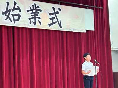 「僕は、今日から若狭小学校の最上級生として、六年生の仲間たちと協力し、若狭っ子のために働き若狭小学校をより良くしていきたいと考えています。そのために、やるべきことは二つあります。一つ目は、下級生たちのお手本となることです。高学年の自分たちが、よい行動・態度をし、それを低学年のみなさんがお手本としまねをしてくれれば、若狭小学校全体がより良くなると思います。二つ目は、良いことを当たり前にすることです。若狭小学校には、良い人がたくさんいるので、当たり前に良いことをして、その良いことの“質”をあげて、いやな思いをせずみんなが楽しく登校できるようにしたいです。卒業生は、とても素晴らしいイベントや若狭っ子の伝統を創り上げ残してくれました。それを自分たちが受け継いで、さらに良くして、新たな若狭っ子たちに託していけたらいいなと思っています。そして、だれから見ても、すごいと思われ、ほこれる最高の若狭小学校をみんなで創っていきたいです。