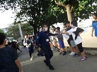 児童は、避難の合言葉「おかしもち」を守って、一時避難場所の運動場、二時避難場所の中央公園に避難することができました。