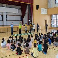 こども園の園児と一年生が参加し、交通安全についてのお話を聞きました。