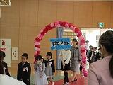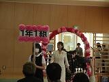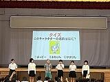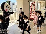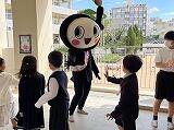 入学を祝って、真和志小の妖精まっピーもかけつけました