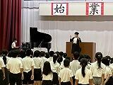 始業式は体育館で1・3・5年生が集合、教室でオンラインで2・4・6年生が参加しました