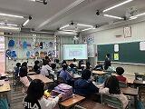 今日の児童朝会は給食委員さんの発表(meet)でした