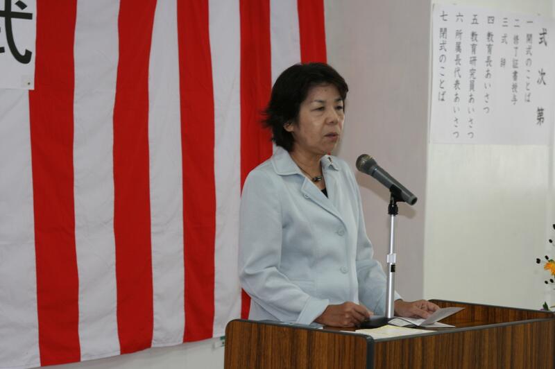 平成23年度 第96期研究員 修了式 平成23年9月28日(水) 修了証書授与 第706号仲盛夫美子 研究員(城北幼) 第707号松川好孝 研究員(真嘉比小) 第708号大城香織 研究員(真地小) 第709号仲宗根歩 研究員(寄宮中) 式辞:田中浩三 教育研究所長 教育長挨拶:城間幹子 教育長 所属長代表挨拶: 仲間公子 真嘉比小校長 修了式が終わって