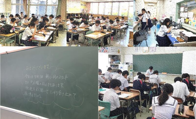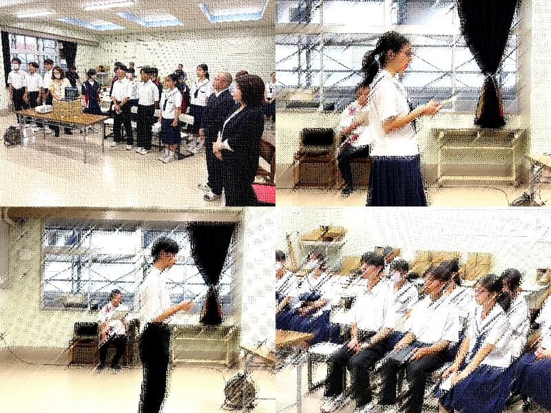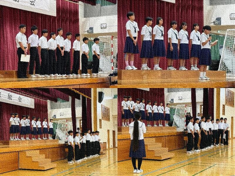2回目の定期テストを目前に控えた1年生は、各クラスでテスト範囲や学習の進め方について確認を行いました。生徒たちは真剣な表情で話を聞き、学習への意識を一層高めていました。2年生は3階ピロティで、今学期から着任された先生の紹介がありました。また、学年主任からは、2学期の大きな行事である修学旅行に向けて、集団行動の大切さや「集団」としての意識をさらに高めていくことについての話がありました。義務教育最後の学期となる3年生は、各クラスの級長の任命式と決意表明を行いました。新級長一人ひとりから、「残された