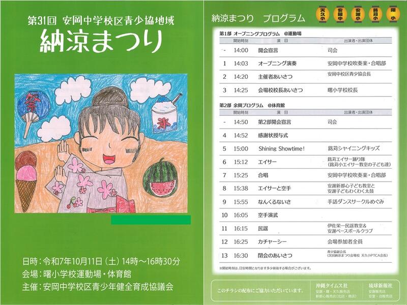 朝夕は秋風が心地よい季節となりました。来る10月11日(土)に、恒例の「第31回安岡中学校区青少協地域納涼まつり」が曙小学校にて開催されます。このお祭りは、1992年(平成4年)に始まり、子どもたちの「ふるさと」づくりを目指して、長年地域で親しまれてきた大切な行事です。主催の「安岡中学校区青少年健全育成協議会(青少協:せいしょうきょう)」は、安岡中学校と校区の小学校4校(安謝小、曙小、銘苅小、天久小)、そして地域の団体で構成されています 。子どもたちが健やかに成長し、地域の一員として活躍できるようサポートする活動を行っている団体です。例年、お祭りでは地域の様々な団体によるダンスやエイサー、本校吹奏楽・合唱部などのステージ発表や、楽しいバザーで大変盛り上がります。本校からも多くの生徒が参加し、日頃の活動の成果を披露しています。ご家族、ご友人と一緒にぜひご来場いただき、生徒たちの活躍に温かいご声援を送りながら、地域交流の輪が広がる楽しい一日を過ごしていただければと思います。(写真は昨年銘苅小学校で開催された際の一コマです)