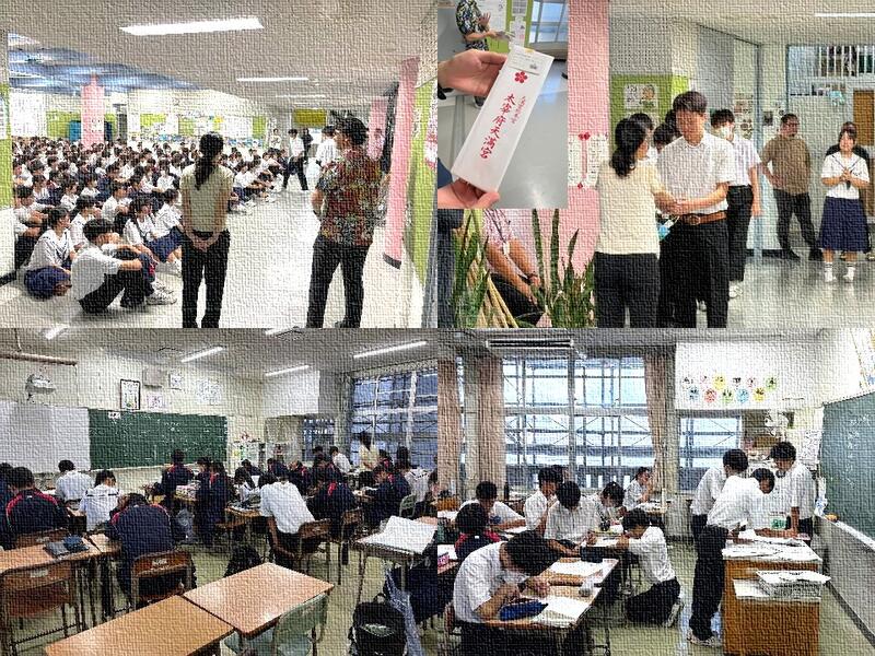 38日間の夏休みを終え、明日から1学期後半が始まります。3年生に関しては、今後の受験等への対応もあり、1日早く今日は午前中だけ登校となりました。休み疲れもあるのかと思ったのですが、元気よく明るく登校していたので、安心しました。朝は3階ピロティで学年集会を持ち、転入生の紹介や、学年の先生方が用意した「合格祈願」のプレゼントを学級代表の生徒に手渡していました。生徒たちの笑顔を見ていると、先生方もにこやかになってきますね。その後の授業では、夏休みの課題の回収や1学期前半の学習の振り返り、今後の単元テストの確認など、明日に向け着々と準備に取り組んでいました。給食はないので午前中の登校になりましたが、3年生にとってはいいスタートが切れたかと思います。さぁ、いよいよ夏休み明けです。張り切っていきましょう!