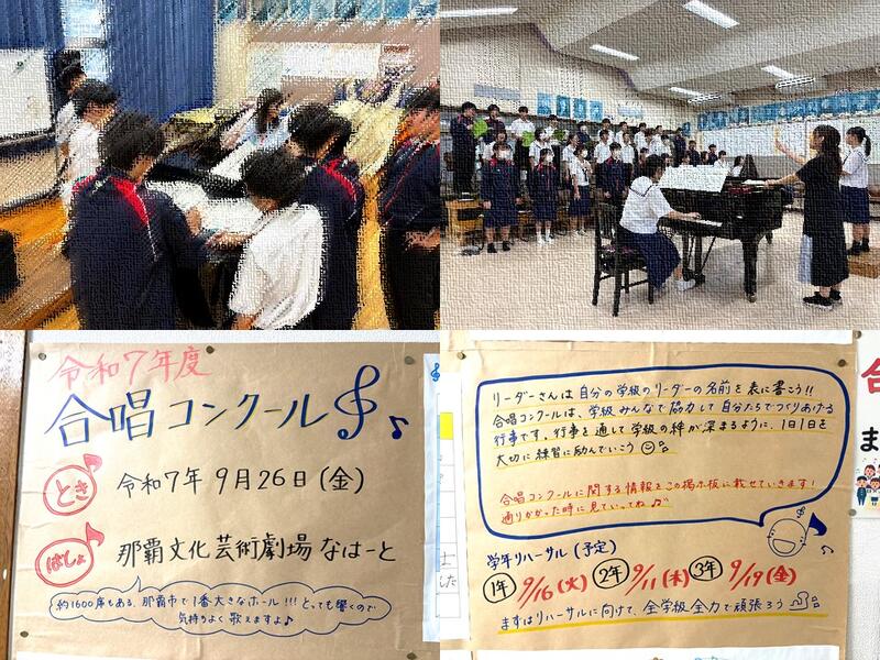 令和7年度校内合唱コンクールのお知らせを、9月3日付のスクリレで発信しております。保護者の皆様にはすでにご確認いただけたことと存じます。今年の校内合唱コンクールは、9月26日(金)に「那覇文化芸術劇場なはーと」にて開催します。県内でも屈指の舞台環境で、生徒たちが合唱に取り組めることを大変嬉しく思います。「なはーと」に関しましては、送迎や座席等の注意点が多くございますので、保護者の皆様にはお配りしたお知らせを再度ご確認いただければ幸いです。