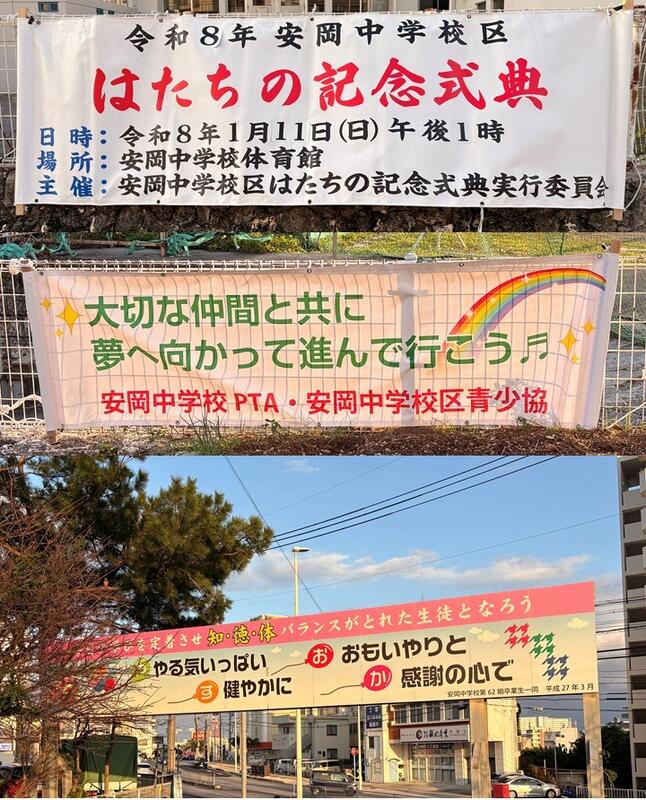 今週末の1月11日(日)、「成人の日」を前に、安岡中学校区『はたちの記念式典』が本校体育館にて開催されます(午後1時開式)。那覇市では各中学校区単位で式典が行われており、本校区でも安岡中校区青少年健全育成協議会の皆様の全面的なバックアップのもと、二十歳を迎えた卒業生自らが実行委員会を組織し、手作りで準備を進めてきました。