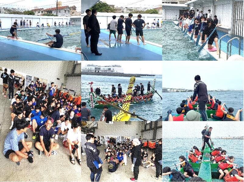 HPトップ画面でも紹介していますが、今年も那覇ハーリー中学生の部に、本校男女選手団が参加します。もともと那覇ハーリーの歴史は古く、琉球王朝時代に始まった伝統行事ですが、中学生の部が始まったのは30年くらい前と比較的新しいといえます。ハーリーの普及と、地域社会の活性化を目的として取り組まれています。現在では、那覇市内のほとんどの学校が参加して、大会を盛り上げています。本校でも2週間前から練習を始めています。部活動との関わりもあるので、朝の時間に行っていますが、最初はプールで櫂(かい)の持ち方、体の使い方、櫂の差し込み方など、基本的なことから始め、リズムに合わせて櫂さばきの練習をしています。安岡中青少協の方にも指導していただいています。ありがとうございます。その練習の中で、2回は実際に海に出て、練習を行うことができます。先週の日曜日には部活の大会の合間を縫って、多くの生徒・職員が参加しました。あいにくの雨模様でしたが、初めての海での練習にドキドキしながらも、楽しそうに頑張っていました。次の海での練習に備えて、今日もプールで練習をしています。次回は4月26日(土)午前9時30分(集合9時)、ハーリー会館前で集合になっています。本番まであと10日、安岡中の旗をひるがえしましょう。