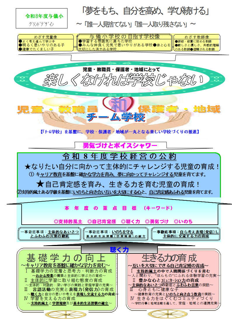 〇自分の気持ちを素直に伝える「表現する力」を大切にしながら、これからの未来を生き抜くための「主体的に学ぶ力」をこの与儀小学校で育んでいけるよう、教職員一同全力でとりくんでまいります。